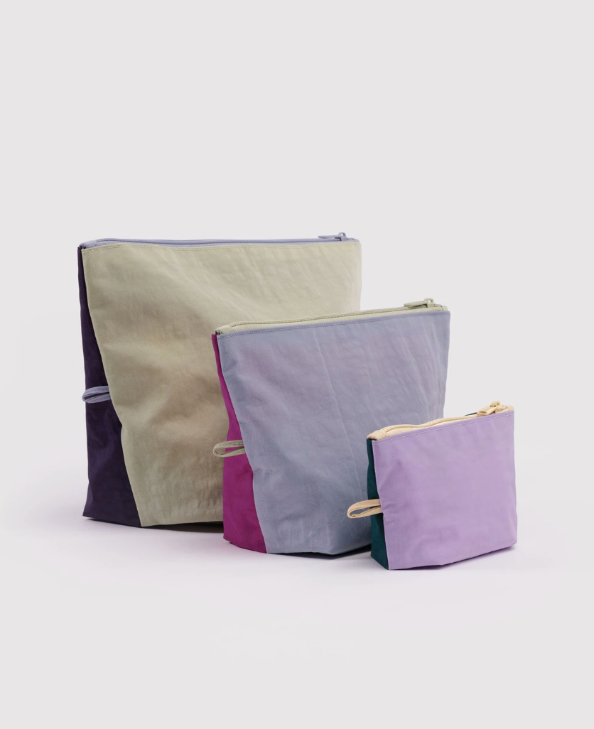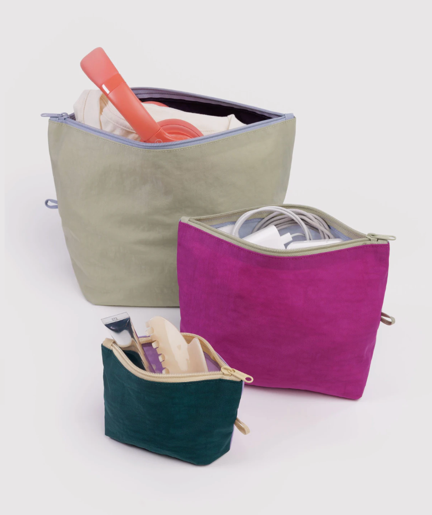 Nuestro set Go Pouch facilita mantener tu bolso ordenado y perfectamente organizado. Lleves lo que lleves —monedas, cables o un par extra de zapatos— este juego de tres estuches multiusos mantiene todo en su lugar. Se expanden para guardar tus artículos esenciales y se aplanan cuando no están en uso.