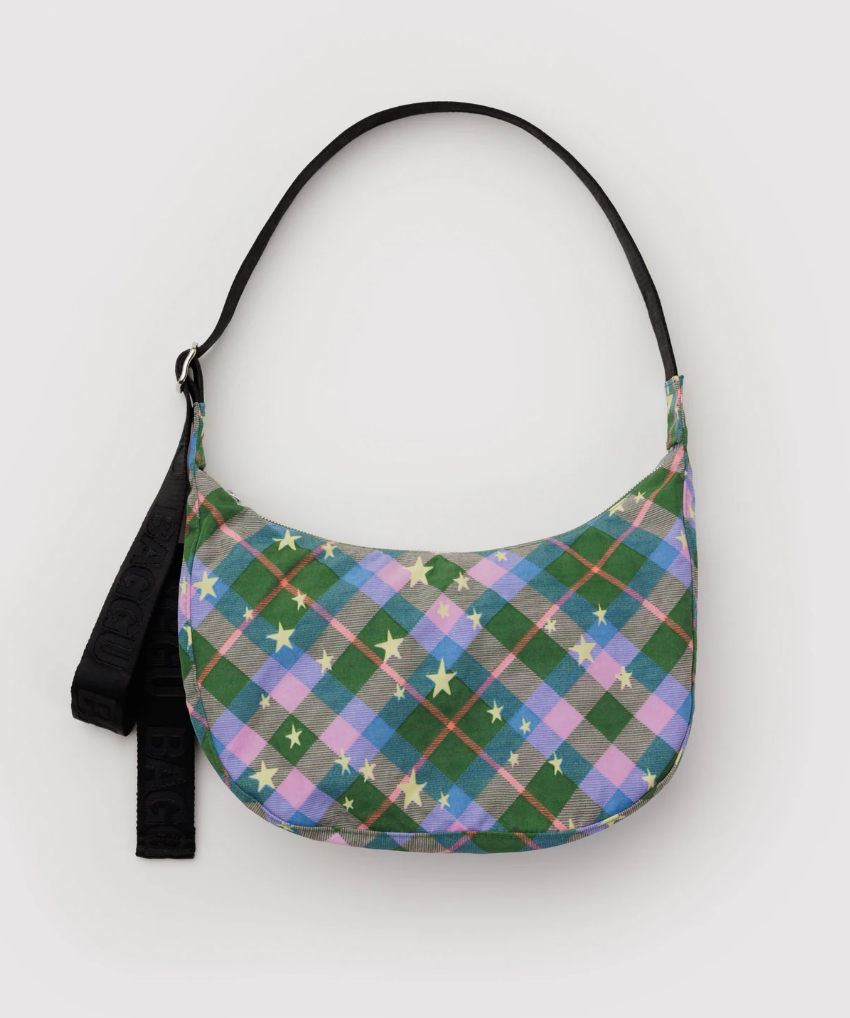 Medium Nylon Crescent Bag - Green Star Plaid